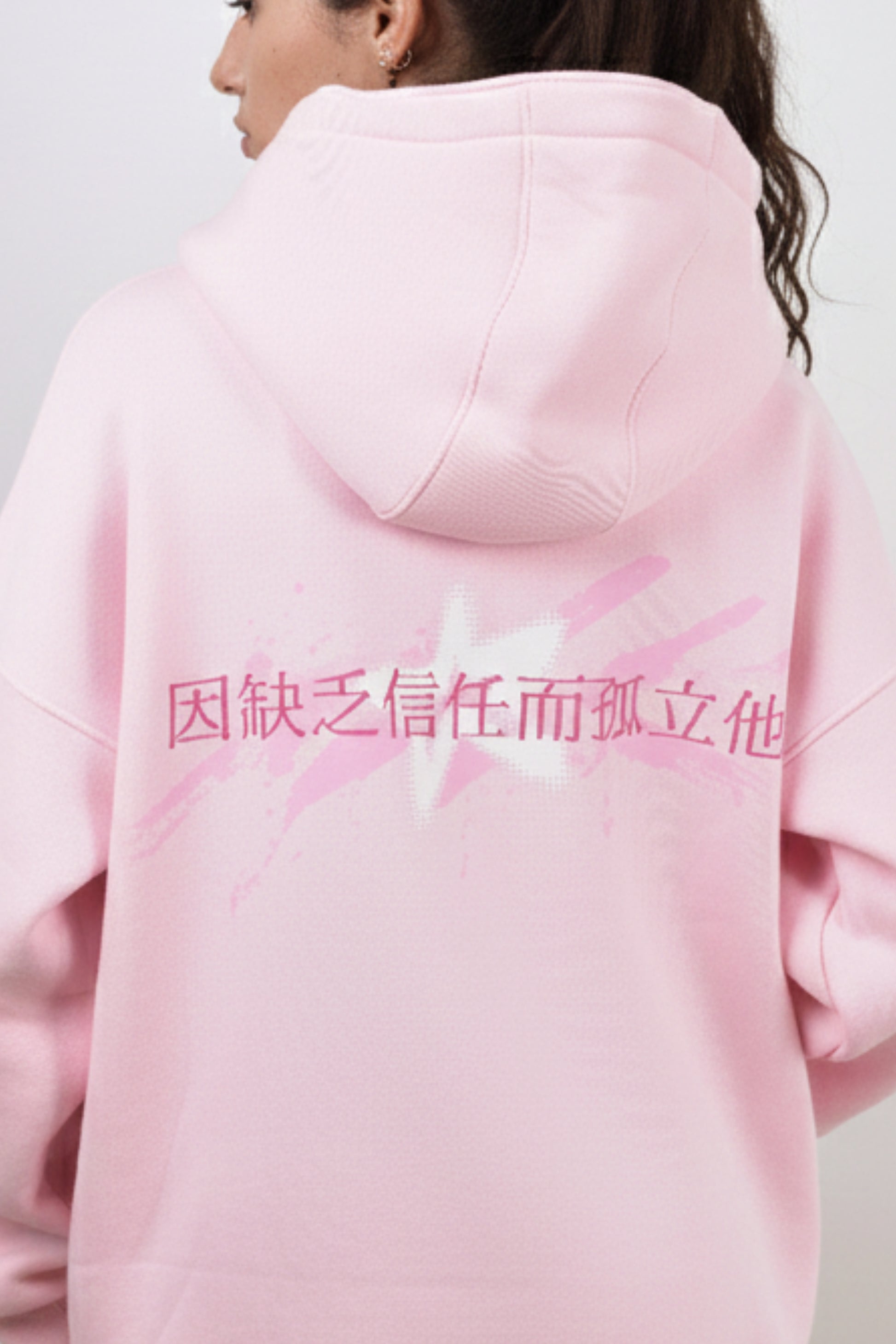 Soft in color, strong in message. The "Trust & Isolation" Hoodie blends pop design with philosophical depth. Made in a calming blush pink tone, the hoodie features a stylized star print on the chest and a bold back graphic with Chinese characters that translate to: